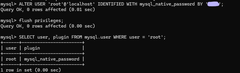 ALTER USER '사용자'@'localhost' IDENTIFIED WITH mysql_native_password BY '비밀번호';