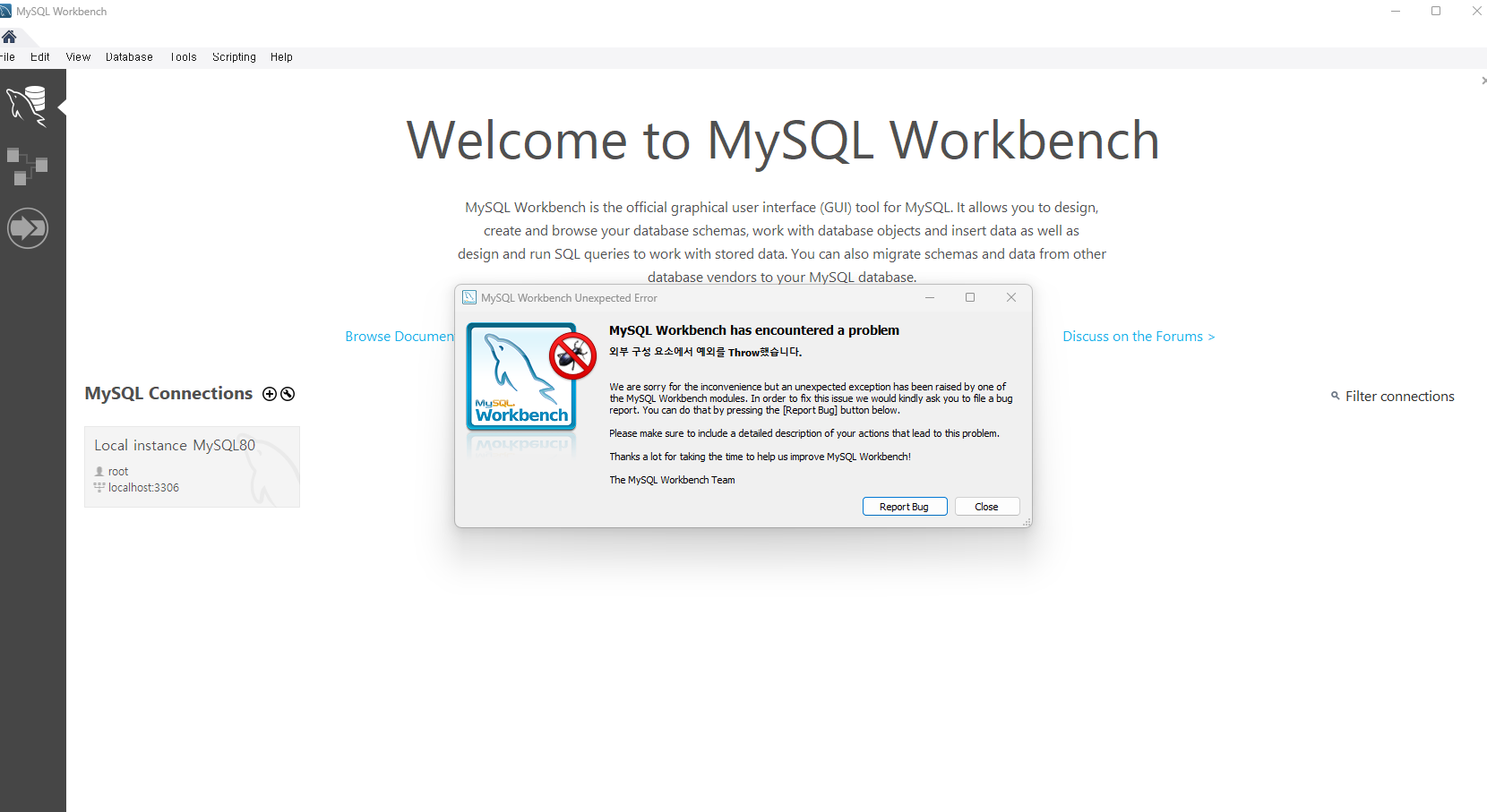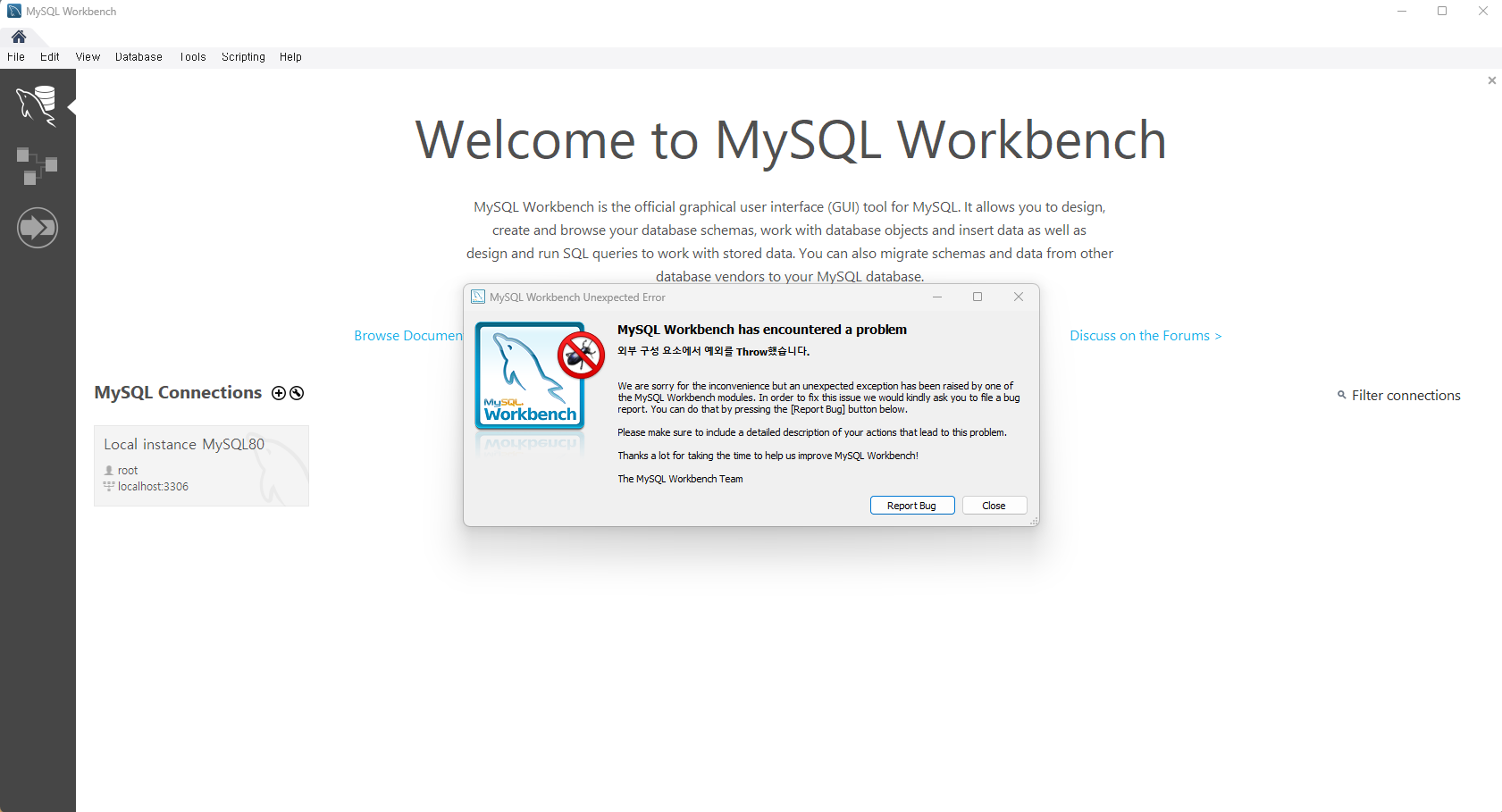 일주일 전부터 워크밴치를 열려고 하면 매번 MySQL Worbench has encountered a problem 에러가 났다.