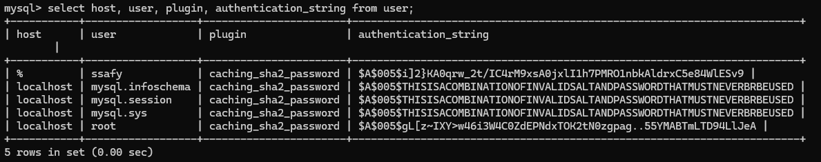 SHA256 : 기본적인 SHA-256 인증을 구현한 플러그인. caching_sha2_password : sha256_password와 동일하지만, 성능 향상을 위해 서버 캐싱을 이용한다.