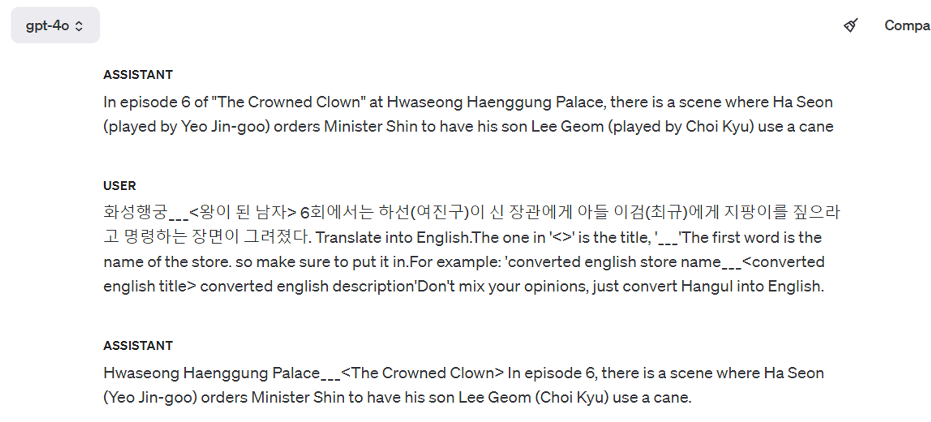 4 vs 4o vs 3.5를 비교했을 때, 번역 수준에 큰 차이가 있지는 않았다. 3.5도 충분히 좋은 성능을 냈다.