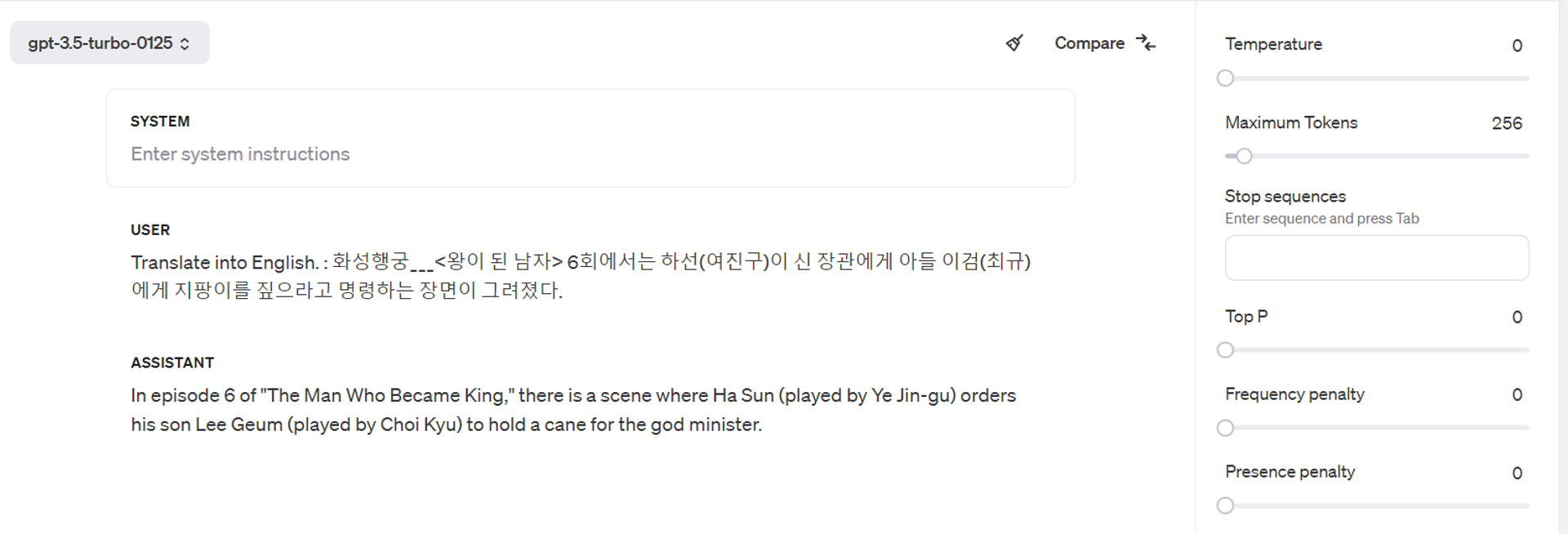 생성형 AI의 할루시네이션이 번역 작업에는 포함되지 않아야 하기 때문에, temperature를 0으로 설정하는 것과 별개로, Don't mix your opinions, just convert Hangul into English.이라는 설명을 추가해서 한 번 더 명시했다.